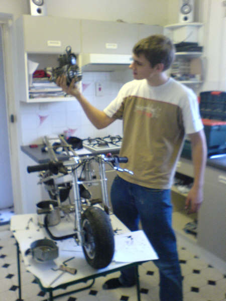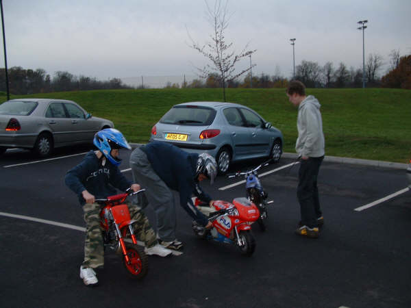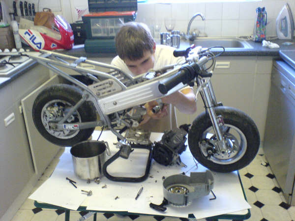 Pictures of the Team and their Mini Moto's Weemun! Ali and Tom having a race Tom and Ali before a quick race! Toby with Mini Moto engine in his hand, the source of all problems!!! Toby doing a rather long service to a Mini Moto (a 3 hour service to be precise!)